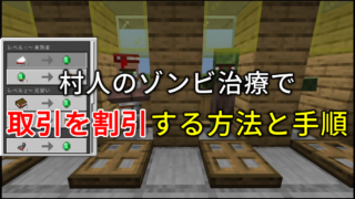 ※各材料横の数値は、エメラルド1個取引するのに必要な個数。 「本と羽ペン」は本・羽根・墨袋でクラフトできます。 マイクラ村人との取引による相場変動の仕組み、相場コントロール法を解説統合版 マイインクラフトサーバーEarthMCでのアイテムの取引相場について解説いたします。 マイクラマルチクレジットカード不要自分のサーバーの立て方 クレジットカードを使わずにコンビニ払いで、15分ほどでサーバーを立てられるように まとめ 村人の取引価格を大幅値引きする方法を紹介しました。 村人から村人ゾンビ、村人ゾンビを治療して村人に戻す、という繰り返しを行えば、取引価格を「1」にすることができます。 この仕組みを利用して激安交易所を作ることも可能です